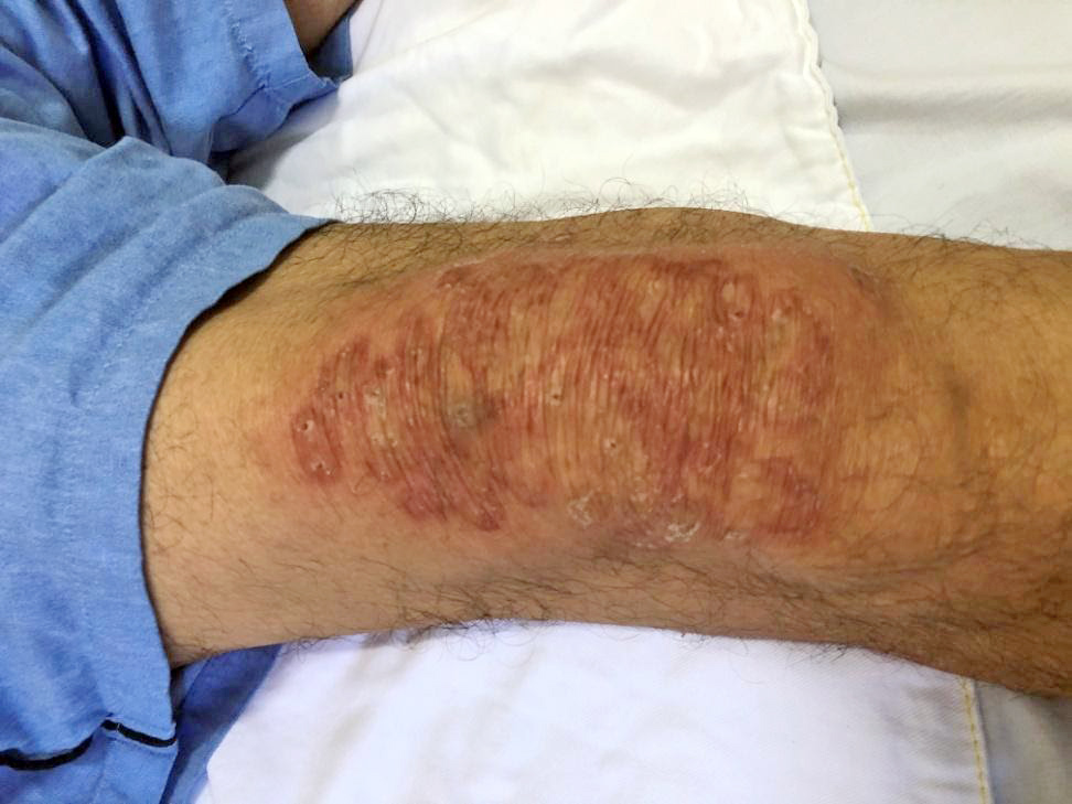 No 10º DIH, foi suspenso a dexametasona. No 11º DIH, piora importante das lesões apresentando placas anulares e policíclicas com pústulas e crostas na periferia centro tendendo à cura, as lesões eram disseminadas em todo tegumento
