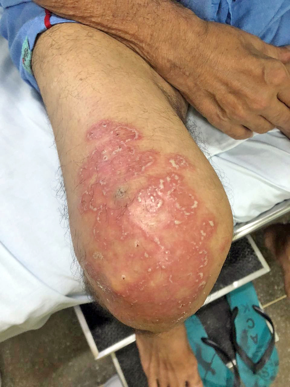 No sexto dia de internação, o paciente evoluiu com piora da dispneia sendo aumentado a dose de dexametasona para 20 mg/d por mais 4 dias. No sétimo dia, foi trocado antibioticoterapia para piperacilina + tazobactam 4,5g. 24 horas após a troca da medicação, na 8º Diária por internação hospitalar (DIH), notou-se lesões discretas eritematosas circinadas não pruriginosas associadas a leucocitose (20200 cel) com desvio até metamielócito.