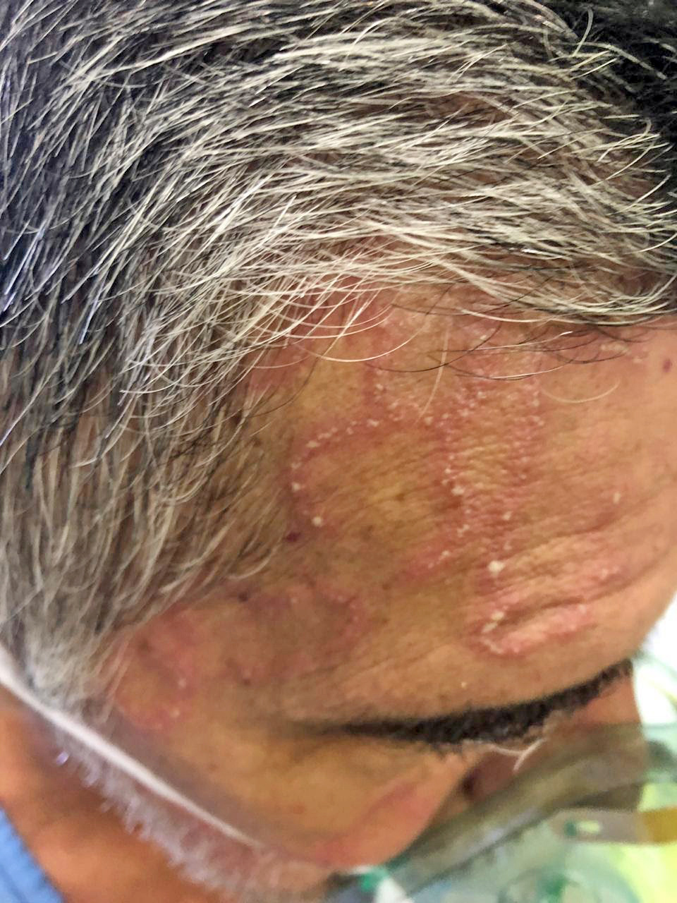 Paciente masculino 63 anos, aposentado, procedente de Pacoti (CE) internado no Hospital São José por 18 dias com COVID-19, na internação não apresentava nenhuma queixa cutânea, apenas alterações pulmonares (tosse, dispneia, ausculta pulmonar com crepitações bibasais, sat o2 94%, frequência cardíaca 93 bpm, afebril, pa 116 x 76 mmhg). Hipertenso, ele fazia uso de losartana.